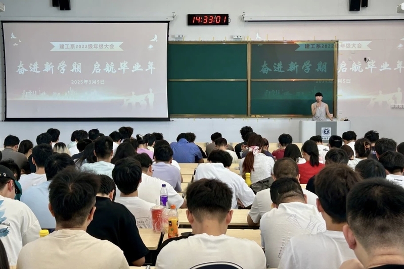 2025年9月5日下午2时30分,建工系22级在好学楼B100召开新学期第一次年级大会。建工系学工办主任孙巧珍、2022级辅导员王蓉及全体学生共同参会,会议由王蓉主持。