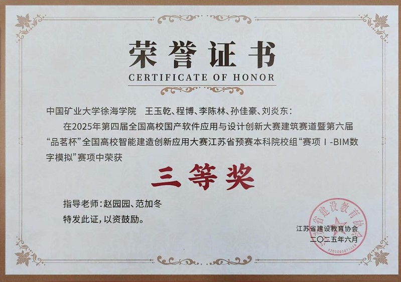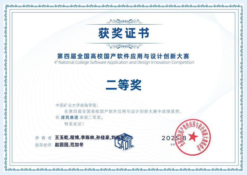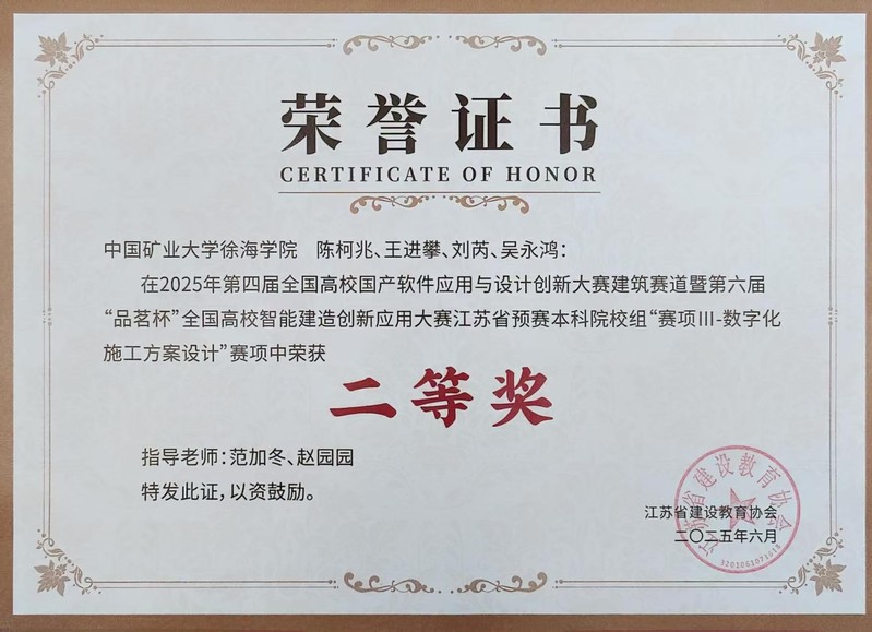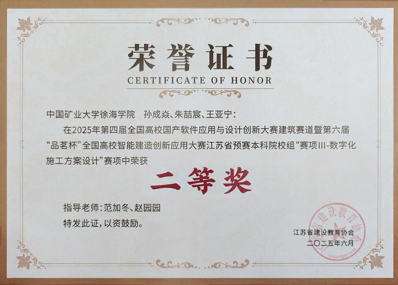 大赛共分为省选拔赛与全国总决赛两个阶段。省赛于2025年5月28日进行,共设“BIM数字模拟”、“数字化工程造价管控”、“数字化施工方案设计”、“智能建造技术”、“建筑机器人工艺编程”等5个赛项,建工系学子在省赛中荣获江苏省二等奖两项,三等奖一项,并成功晋级全国总决赛。在8月28日的全国总决赛中,我系学子凭借扎实专业的功底、出色的现场表现,最终荣获全国二等奖一项,同时中国矿业大学徐海学院被评为优秀组织单位。