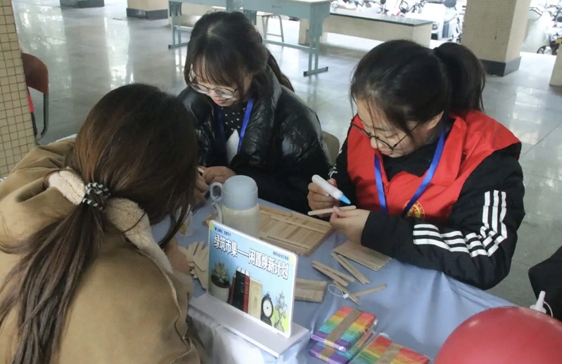 在“筑梦微筑”的雪糕棒DIY区,同学们用巧手将一根根雪糕棒变为精巧的微型建筑,在实践中感受结构的奇妙;在“安全筑家”的知识答题区,大家通过趣味问答解锁建筑与生活安全实用技能,问答后的抽奖环节更是惊喜连连;在“绿筑市集”的闲置焕新区,书籍、文具等旧物得以流转新生,绿色、共享的理念在交换中悄然传递。